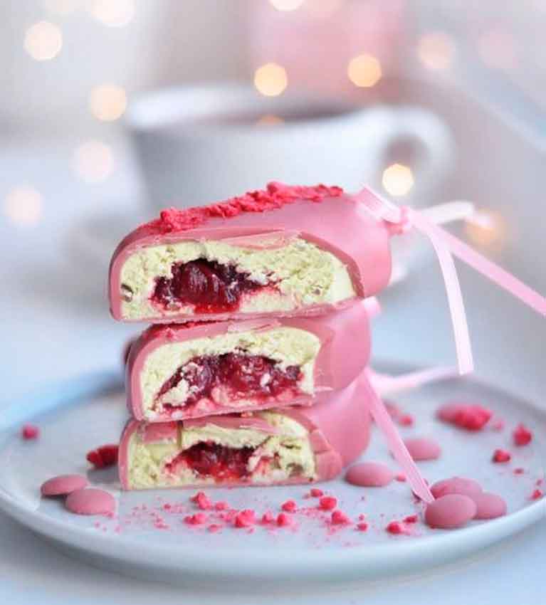 Фисташковые творожные эскимо с вишневой начинкой в рубиновом шоколаде Callebaut Ruby