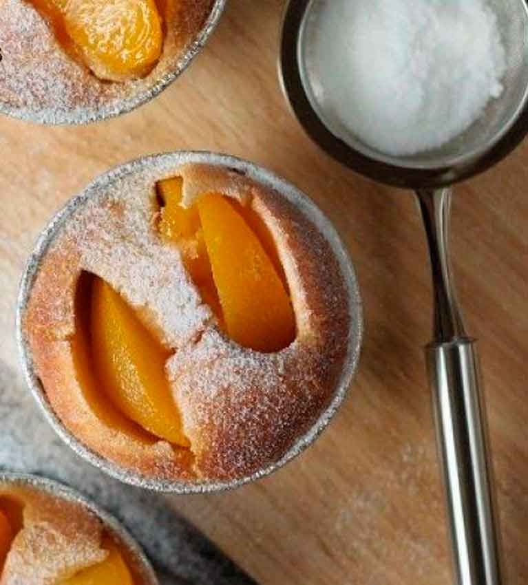 — 50 г муки; — 40 г сливочного масла, разделить; — 80 мл молокf; — 4 половинки персика в сиропе; — 1 яйцо; — 1 яичный желток; — 3 ст. л. сахарной пудры; — цедра 1/2 лимона; — несколько капель ванильного экстракта; — сахарной пудра для украшения.Приготовление:
